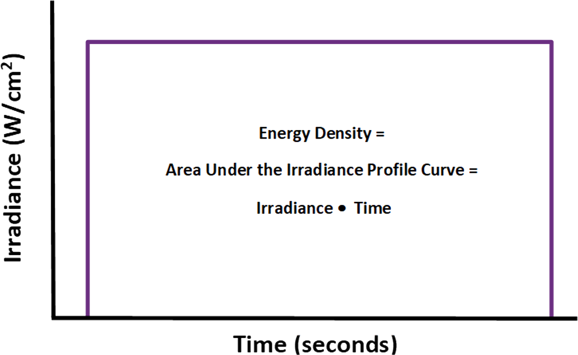 ความหนาแน่นของพลังงาน (J/cm2) คือพลังงานที่ระบบส่งออกทั้งหมดในช่วงเวลาหนึ่งต่อหน่วยพื้นที่ และมักเรียกว่าปริมาณรังสี ในทางคณิตศาสตร์ ความหนาแน่นของพลังงานคืออินทิกรัลของความเข้มของแสงในช่วงเวลาหนึ่ง และมักประมาณค่าโดยการคูณความเข้มของแสงสูงสุดกับค่าการได้รับแสงหรือระยะเวลาที่แสงส่องผ่าน อย่างไรก็ตาม โดยทั่วไปแล้ว การประมาณค่าด้วยการคูณจะให้ค่าความหนาแน่นของพลังงานที่สูงเกินไป เนื่องจากความเข้มของแสงที่พื้นผิวบ่มมักจะไม่คงที่ ซึ่งแสดงด้วยโปรไฟล์ความเข้มของแสงแบบคงที่และแบบไดนามิกต่อไปนี้ โดยที่ความหนาแน่นของพลังงานจะเทียบเท่ากับพื้นที่ใต้เส้นโค้ง